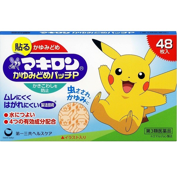 | 일본 제약회사 다이이치산쿄(第一三共)에서 만든 마키론 피카츄 모기패치 48매입은 귀여운 피카츄 디자인으로 아이들도 좋아하는 붙이는 타입의 가려움 완화 패치입니다. 무스테로이드(non-steroid) 성분으로 민감한 피부에도 사용 가능하며, 곤충에 물렸을 때 생기는 가려움증이나 자극을 효과적으로 진정시켜줍니다. 물이나 땀에도 강한 접착력으로 쉽게 떨어지지 않으며, 야외활동이나 여행 시에도 휴대하기 좋습니다. 제품 하나에 48매가 들어 있어 가족 모두가 사용할 수 있는 실속형 제품입니다. | |