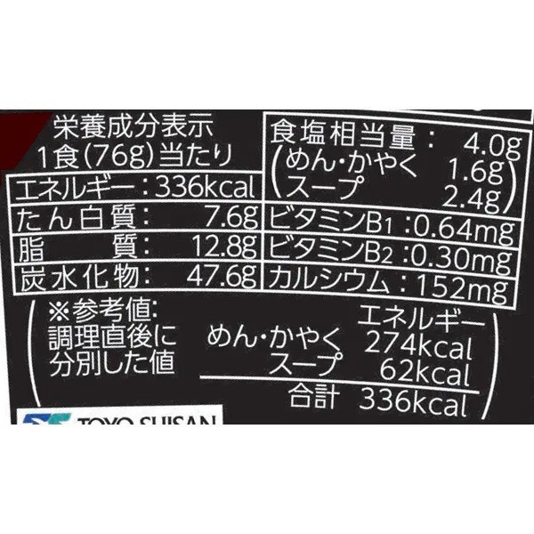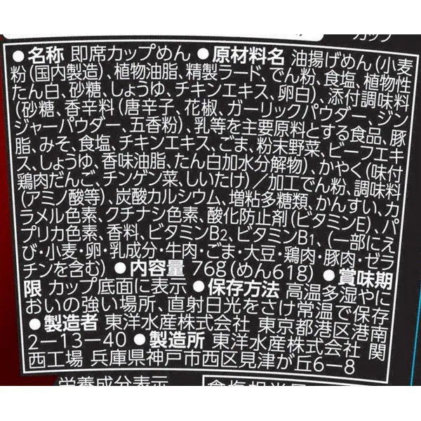 면: 소맥분, 식물성 유지, 정제 라드 등 스프: 향신료(고추, 화자오 등), 육수 추출물, 소금, 설탕, 향미유 등 기타: 건조 야채, 고기 조각 포함 알레르기 유발 성분: 밀, 달걀, 우유, 대두, 돼지고기, 닭고기, 소고기, 새우 등 |