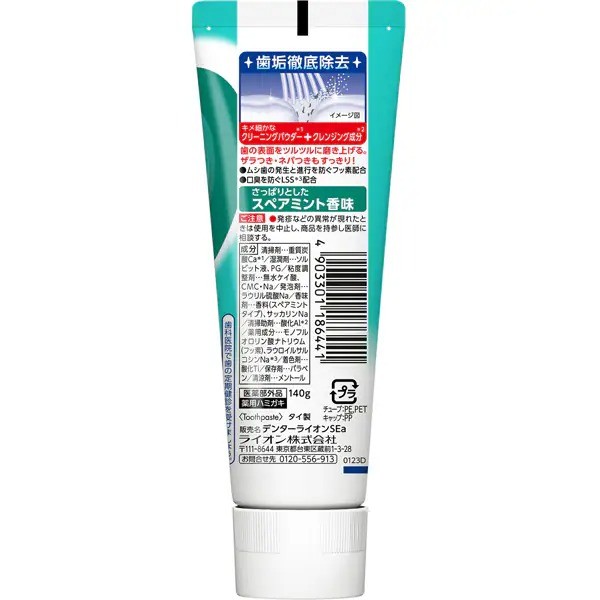 **청소제**: 중질탄산칼슘 **습윤제**: 소르비톨액, PG **점도조절제**: 무수규산, CMC·Na **발포제**: 라우릴황산Na **향료**: 스페어민트향, 사카린Na **클렌징 보조제**: 산화Al **약용 성분**: 모노플루오로린산 나트륨(플루오르화물), 라우로일살코신Na **청량제**: 멘톨 **착색제**: 산화Ti **보존제**: 파라벤 |