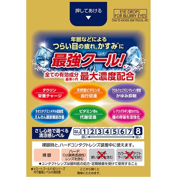 | **로토 V로트 골드 40 상쾌 MAX**는 컴퓨터 사용, 독서, 중장년층의 눈 피로와 흐림 증상 완화에 적합한 점안액입니다. 타우린, 비타민B₆, 천연 비타민E 등 6가지 유효성분이 기준 내 최대 농도로 배합되어 효과적이며, ‘극강 쿨감’을 자랑하는 상쾌한 사용감을 제공합니다. 풍부한 용량 20 ml로 오랫동안 사용 가능하며, 점안 후 눈을 상쾌하게 해줍니다. | |