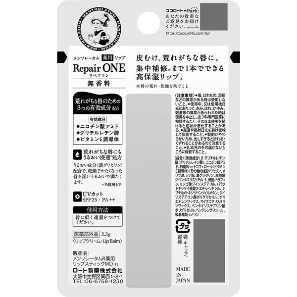 | 건조하고 껍질이 일어나기 쉬운 입술을 위한 고보습 약용 립밤입니다. 니코틴산아미드, β‑글리치레틴산, 비타민 E 유도체의 3중 유효성분이 입술 트러블과 거칠어짐을 케어하며, 고농도 글리세린이 깊은 보습막을 형성해 부드럽고 촉촉한 입술로 가꿔줍니다. 또한 SPF25/PA++의 자외선 차단 기능을 갖추고 있어 야외 활동 중에도 입술을 보호해 줍니다. 무향 타입으로 향에 민감한 분들도 안심하고 사용 가능합니다. | |