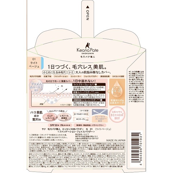 | 이 제품은 “모공 파테 장인 에센스 BB 파우더 N 01 라이트베이지”입니다. 피부의 모공, 잔주름, 색소 침착, 칙칙함 등을 자연스럽게 커버하여 매끈하고 균일한 피부로 연출해주는 BB 파우더입니다. 파운데이션, 컨실러, 페이스파우더 역할을 동시에 할 수 있어, 베이스 메이크업을 간편하게 완성할 수 있습니다.SPF50+ · PA++++의 자외선 차단 기능을 갖추어, 자외선 차단까지 함께 가능합니다. | |
