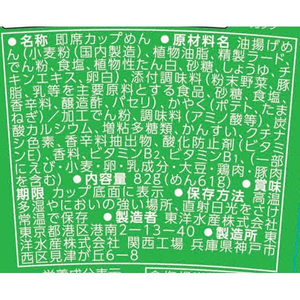 | 면: 소맥분, 식물성 유지, 정제 라드 등 스프: 사워크림 풍미분, 양파 분말, 향신료, 소금, 설탕 등 기타 부재료: 건조 야채 등 포함 알레르기 유발 성분: 소맥(글루텐), 우유, 달걀, 대두, 닭고기, 돼지고기, 소고기, 기타 포함. | |